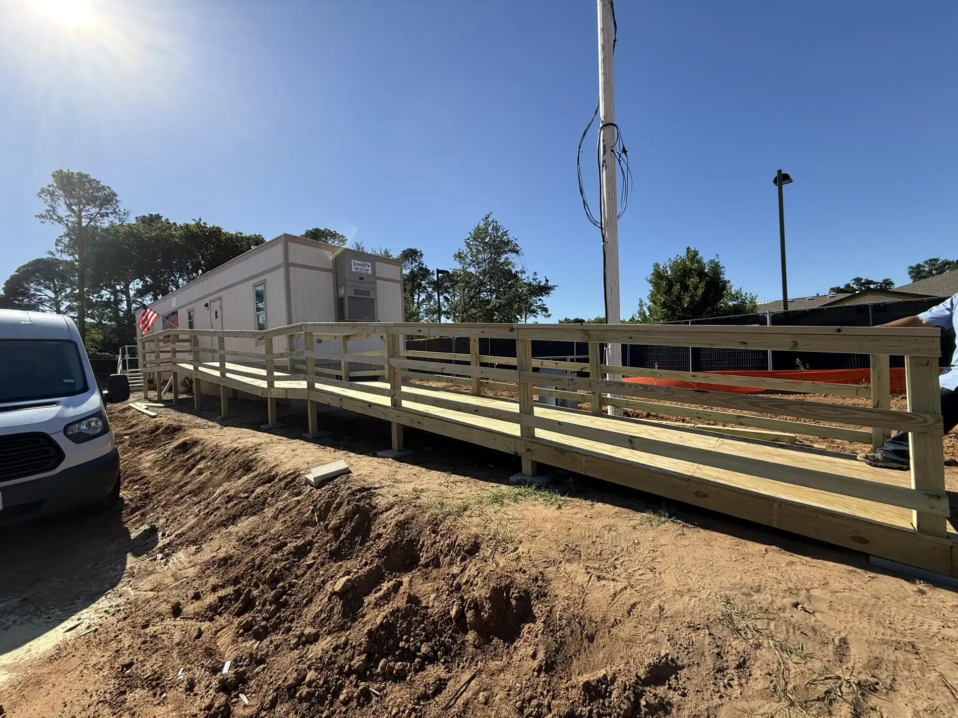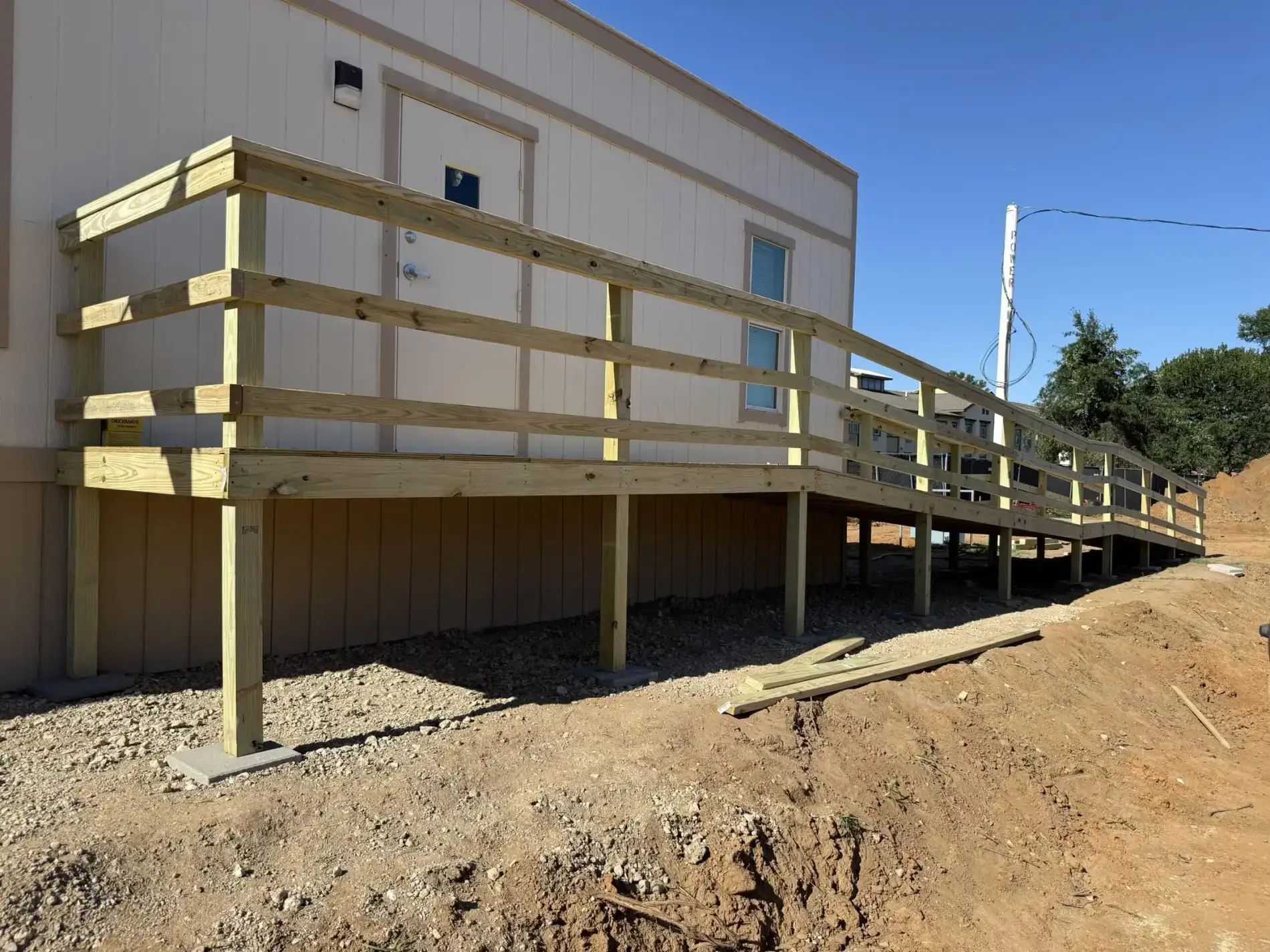 At Handyman Home Pros, we recently rolled up our sleeves and got to work on a Deck Repair & Refinishing project in North Richland Hills. The task involved building a sturdy and reliable ramp for a construction trailer onsite. This ramp is more than just timber and nails; it’s a critical piece of equipment, enabling safe and easy access to the trailer, and facilitating seamless day-to-day operations. It’s projects like this that get us out of bed in the morning – practical, hands-on work that delivers real, tangible benefits for our clients. Deck Repair & Refinishing is just one of the many services we offer. Get an estimate today!